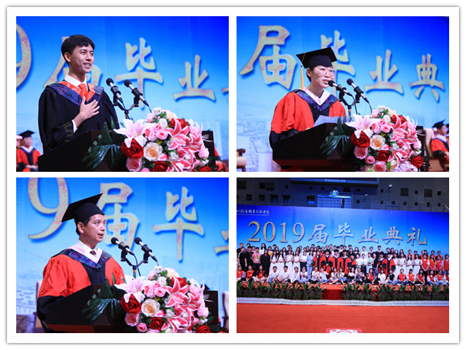 典礼上,财经学院党总支张立军书记宣读了财经学院2019届优秀毕业生名单;赵根宏副院长宣读了2019届毕业生毕业资格审核报告;教师代表金融管理专业赵妮主任表达了对2019届毕业生的祝愿,祝同学们以梦为马,不负韶华;优秀毕业生代表蔡家豪同学表达了对母校深深的感恩和对老师同学们的依依惜别之情。