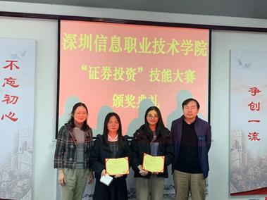 2019年12月27日,由财经学院主办的2019年深圳信息职业技术学院专业技能大赛“证券投资”竞赛圆满收官。在颁奖仪式上,财经学院赵根宏副院长、李琼副院长为获胜的团队与个人颁发证书及奖品。