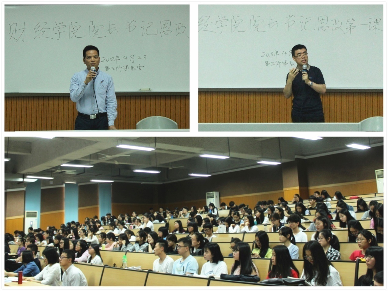 4月2日下午,财经学院林徐润院长、张立军书记在学思楼第三阶梯教室为2016级、2017级入党积极分子和各班学生干部、团学干部近两百人讲授思政第一课,全体辅导员参加学习。