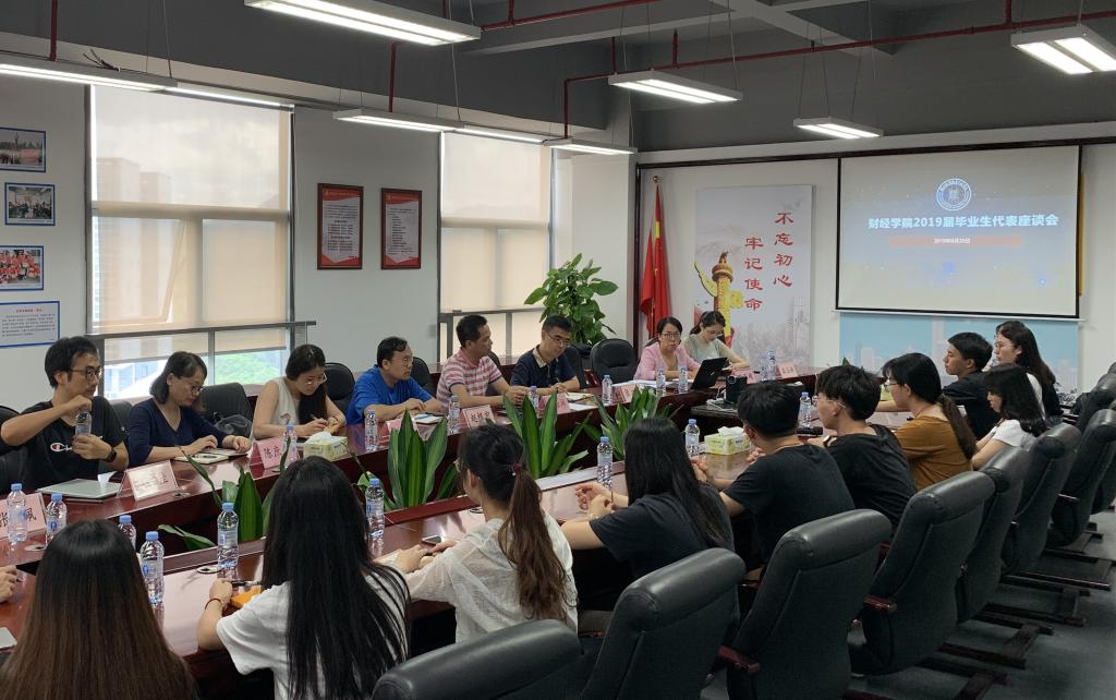 6月20日下午,财经学院在科技楼1308召开2019届毕业生代表座谈会。学院领导班子、各专业教研室主任、教务办负责人、学生办负责人以及15名毕业生代表参加了会议。会议由党总支书记张立军主持。