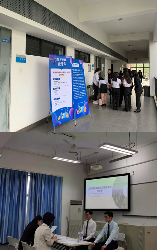 10月30日下午,财经学院在学思楼四举办保险、金融类专场校园招聘会,邀请了招商银行网络经营服务中心、中国太平保险集团、中国太平洋人寿保险公司、中国人寿保险公司等四家企业参加,提供了近300多个就业岗位。招聘会上,负责人通过播放宣传片、PPT展示、面对面交流的方式向毕业生们介绍公司的概况、职业发展方向以及人员需求,并现场进行了笔试和面试环节。