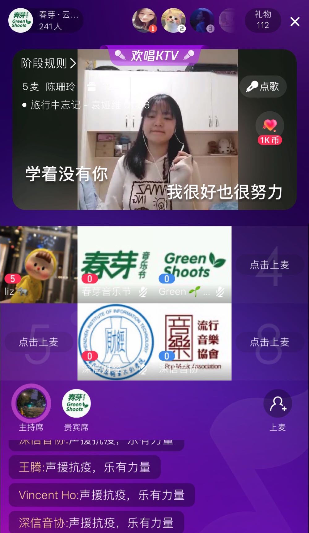 特殊时期,“春芽”应时而变,通过网络直播互动模式,探索、实现了全新的活动形式。当晚,十多位学生歌手均在不同地点参加本次活动。活动由主持人实时云主持,与所有歌手进行连线互动,歌手们带着温暖而有力量的歌声与观众透过线上平台隔空交流,这样的形式为活动增添了许多新意。音乐是人类最美好的情感表达,疫情无情人有情,音乐跨越山海,传递真情与关爱。本次活动时长约一个半小时,吸引了近300人观看,收获23000支鲜花点赞,取得了良好的效果。